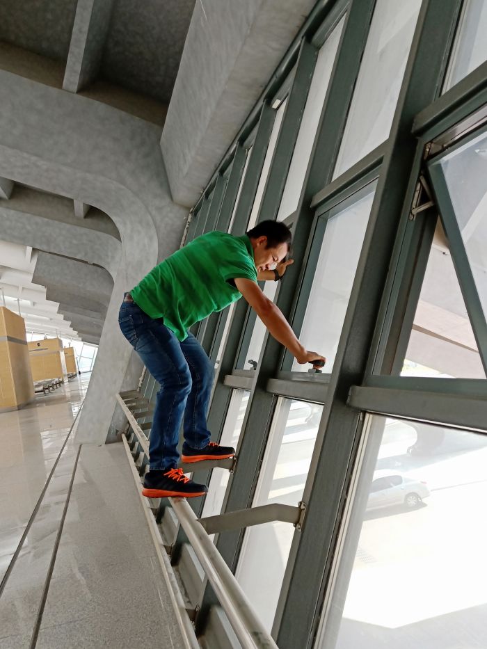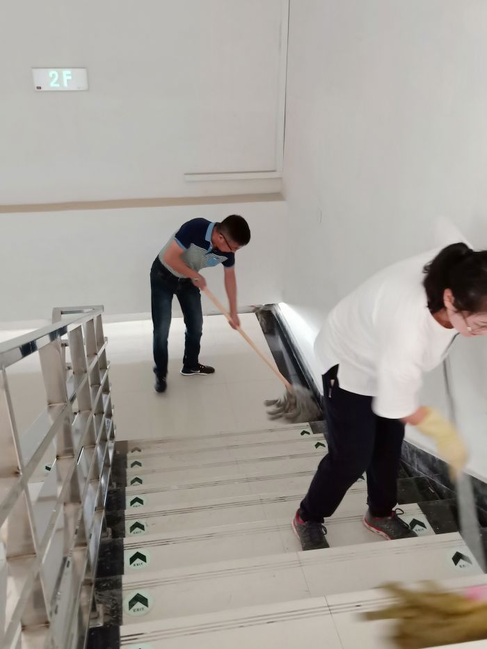 主站樓部分是攻堅之戰,30位員工在透明的頂棚下感受悶熱灼曬、揮汗如雨,每一塊地磚都是經過了水沖、塵推、除塵、清洗、抹凈、擦干等六道工序,方可達標。上下兩層共26912平方米,經過兩天半的時間終于完工,看著光亮如新、纖塵不染的候車廳,所有員工的臉上都綻放了發自內心的微笑。