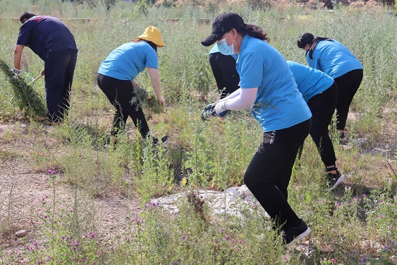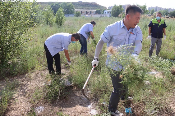活動現(xiàn)場,黨支部書記娜仁、經(jīng)理史濤帶領(lǐng)大家在各自的責(zé)任區(qū)域內(nèi)分片作業(yè)。大家在炎炎烈日下,揮汗如雨、干勁十足,有的拔除蒿草、有的收集清運……經(jīng)過一下午地辛勤作業(yè),小區(qū)及周邊的蒿草不見了,空氣清新了,環(huán)境也變美了。
